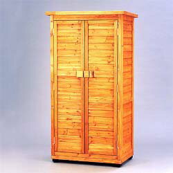 【特長】●家の軒下や勝手口の外、ベランダなどに適した木製の物置です。 プラスチック製トレー付きのため、小物の収納にも便利な上、物置 内のスペースを無駄なく活用することが可能です。また、レールの 位置が調節可能ですので、大小のトレーを自由に入れ替え可能 です。(トレー小は横向きでも入ります。)●商品全体のデザイン性に配慮した木製の取っ手部分はかんぬき 式の扉止めになっていて、扉の開閉が楽に行えます。扉の裏側に は反り返りを防止する補強金具を付けました。●脚には地面との設置面を腐りにくくするプラスチック製のキャップと ガタツキを防止するアジャスターが付いています。屋根は住宅用の 屋根材を使用し、雨